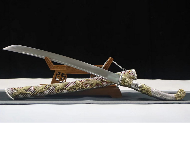 总长:91cm刃长:59cm柄长:31cm刃宽:4cm刃厚:0.75cm硬度:60HRC刃材:自炼钢鞘材:白铜鎏金银装具:铜鎏金鎏银工艺:淬火(油)—回火锻打程度:十三道纯手工研磨赠品:锦盒-刀油-收藏证书-刀架重量:1.3kg
