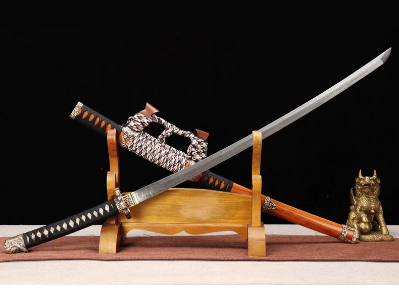 商品参数 总长:103cm 刃长:72cm 刃宽:3.2cm 刃厚:0.7cm 硬度:60HRC 刃材:百炼钢 鞘材:酸枝木 装具:纯铜 工艺:淬火(油)—回火 锻打程度:十三道纯手工研磨 赠品:锦盒-刀油-收藏证书-刀架