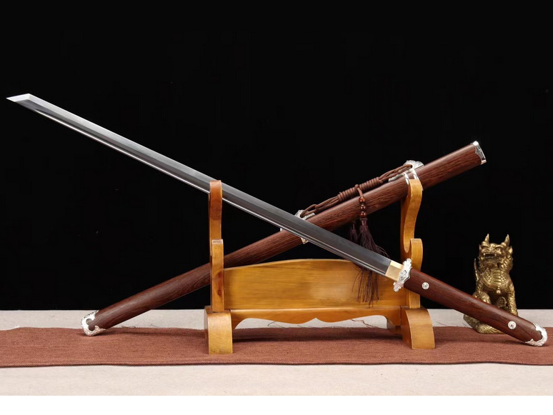 商品属性 [总长] 100cm [刃长] 72cm [柄长] 26cm [刃宽] 3.2cm [刃厚] 0.7cm [硬度] 58HRC [刃材] 锰钢 [鞘材] 花梨木 [装具] 镀银 [工艺] 淬火(油)—回火 [锻打程度] 十二道纯手工研磨 [赠品] 锦盒-刀油-收藏证书-刀架 [重量] 1.4kg