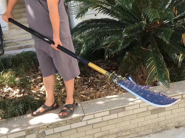 商品属性 [总长] 173cm [刃长] 45cm [柄长] 128cm [刃宽] 9.5cm [刃厚] 0.7cm [硬度] 58HRC [刃材] 锰钢 [柄材] 铁装 [工艺] 淬火(水)—回火 [锻打程度] 十二道纯手工研磨 [赠品] 锦盒-刀油-收藏证书-刀架 [重量] 3.8kg