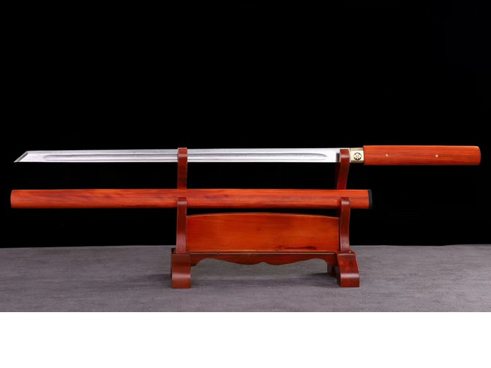 商品属性 [总长] 100cm [刃长] 72cm [柄长] 25cm [刃宽] 3.2cm [刃厚] 0.5cm [硬度] 59HRC [刃材] 花纹钢 [鞘材] 红木 [工艺] 淬火(盐水)—回火 [赠品] 锦盒-刀油-收藏证书-刀架 [重量] 1200g