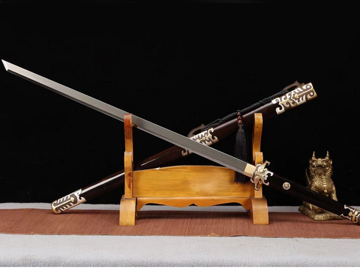 商品属性 [总长] 104cm [刃长] 72cm [柄长] 26cm [刃宽] 3.2cm [刃厚] 0.7cm [硬度] 60HRC以上 [刃材] 乌兹钢 [鞘材] 紫光檀木 [装具] 铜装 [工艺] 覆土烧刃—回火 [锻打程度] 十四道纯手工研磨 [赠品] 锦盒-刀油-收藏证书-刀架 [重量] 1350g