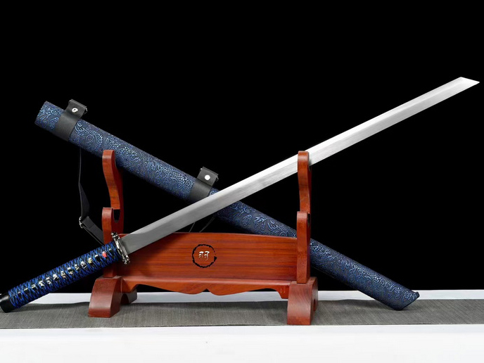 商品参数 总长:99cm 刃长:67cm 柄长:25cm 刃宽:3.2cm 刃厚:0.5cm 硬度:56HRC 鞘材:实木包皮革 装具:合金 赠品:锦盒-刀油-收藏证书-刀架 重量:1.1kg