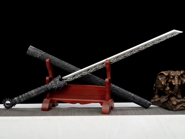 商品参数 总长:111cm 刃长:71cm 柄长:30cm 刃宽:3.8cm 刃厚:0.5cm 硬度:58HRC 刃材:锰钢 鞘材:实木包皮革 装具:合金 赠品:锦盒-刀油-收藏证书-刀架 重量:2.1kg