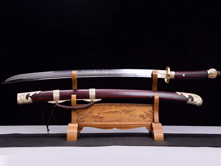 商品属性 [总长] 100cm [刃长] 70cm [柄长] 23cm [刃宽] 3.4cm [刃厚] 0.75cm [硬度] 60HRC以上 [刃材] 高碳钢T10 [鞘材] 血檀木 [柄材] 血檀木 [装具] 纯铜 [工艺] 覆土烧刃—回火 [锻打程度] 十五道纯手工研磨+上研 [赠品] 锦盒-刀油-收藏证书-刀架 [重量] 1865g 除鞘重1145g
