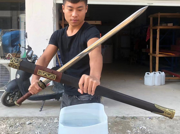 总长:108cm刃长:75cm柄长:26cm刃宽:3.8cm刃厚:0.8cm硬度:60HRC刃材:百炼钢鞘材:乌木装具:铜锌合金工艺:淬火(水)—回火锻打程度:十三道纯手工研磨赠品:锦盒-刀油-收藏证书-刀架重量:全重1.8kg,净重1.3kg![]()