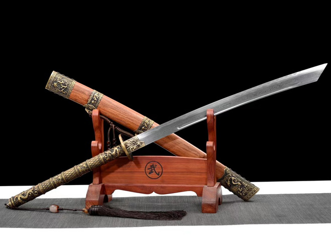 商品属性 [总长] 110cm [刃长] 65cm [柄长] 40cm [刃宽] 4.3cm [刃厚] 0.7cm [硬度] 60HRC以上 [刃材] 百炼钢 [鞘材] 酸枝木 [装具] 铜装 [工艺] 覆土烧刃—回火 [锻打程度] 十三道纯手工研磨 [赠品] 锦盒-刀油-收藏证书-刀架 [重量] 2.88kg