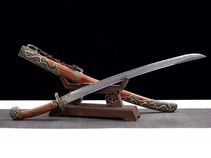 商品属性 [总长] 98cm [刃长] 72cm [柄长] 24cm [刃宽] 3.8cm [刃厚] 0.8cm [硬度] 60HRC以上 [刃材] 百炼钢 [刃表面] 双线精研 [鞘材] 酸枝木 [装具] 铜装 [工艺] 覆土烧刃—回火 [锻打程度] 十五道纯手工研磨+上研 [赠品] 锦盒-刀油-收藏证书-剑架 [重量] 3.36kg 净重1.6kg