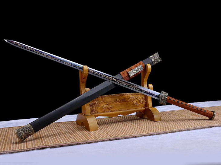 商品属性 [总长] 108cm [刃长] 77cm [柄长] 26cm [刃宽] 3.6cm [刃厚] 0.8cm [硬度] 58HRC [刃材] 锰钢 [鞘材] 乌木 [装具] 合金 [工艺] 淬火(盐水)—回火 [锻打程度] 十三道纯手工研磨 [赠品] 锦盒-刀油-收藏证书-剑架 [重量] 全重1.7kg,净重1.1kg
