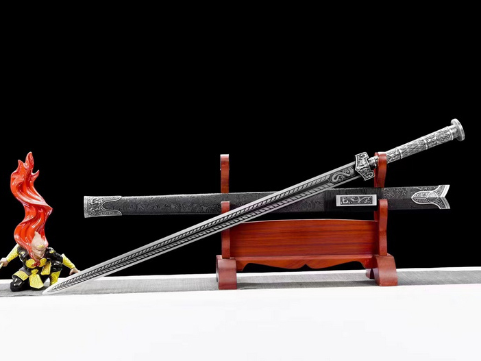 商品参数 总长:103cm 刃长:72cm 柄长:21cm 刃宽:3.8cm 刃厚:0.5cm 硬度:58HRC 刃材:锰钢 鞘材:实木包皮革 装具:合金 赠品:锦盒-刀油-收藏证书-剑架 重量:1.5kg