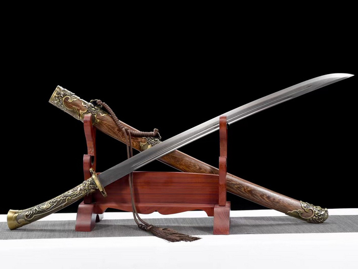 商品属性 [总长] 102cm [刃长] 70cm [柄长] 25cm [刃宽] 3.8cm [刃厚] 0.5cm [硬度] 60HRC [刃材] 百炼钢 [鞘材] 花梨木 [装具] 合金 [锻打程度] 十三道纯手工研磨 [赠品] 锦盒-刀油-收藏证书-剑架 [重量] 全重1.95kg,净重1.25kg