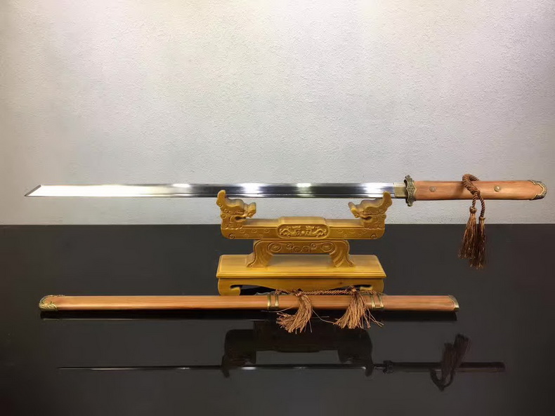 商品属性 [总长] 102cm [刃长] 72cm [柄长] 27cm [刃宽] 3.2cm [刃厚] 0.7cm [硬度] 59HRC [刃材] 锰钢 [鞘材] 酸枝木 [柄材] 酸枝木 [装具] 合金 [柄卷] 丝绳品 [下绪] 丝绳品 [工艺] 淬火(盐水)—回火 [锻打程度] 十三道纯手工研磨 [赠品] 锦盒-刀油-收藏证书-刀架