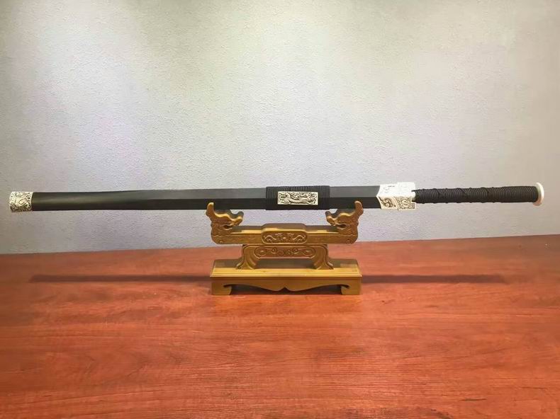 商品属性 [总长] 108cm [刃长] 75cm [柄长] 25cm [刃宽] 3.7cm [刃厚] 0.75cm [硬度] 58HRC [刃材] 花纹钢 [刃表面] 发红处理 [鞘材] 乌木 [装具] 合金镀银 [柄卷] 丝绳品 [工艺] 淬火(油)—回火 [锻打程度] 十三道纯手工研磨 [赠品] 锦盒-刀油-收藏证书-刀架