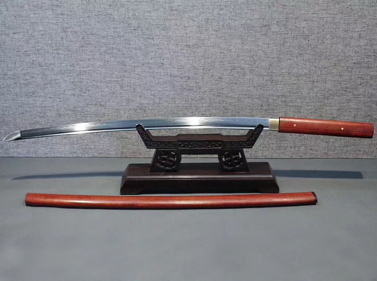 商品参数 总长:102cm 刃长:72cm 柄长:27cm 刃宽:3.2cm 刃厚:0.7cm 硬度:60HRC 鞘材:红木 柄材:红木 工艺:覆土烧刃—回火 锻打程度:十三道纯手工研磨 赠品:锦盒-刀油-收藏证书-刀架