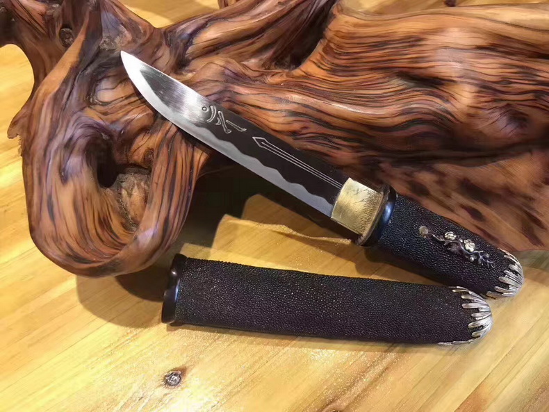 描述:百炼钢上研磨~鲤口手工包牛角总长:30cm刃长:17cm柄长:10cm刃宽:2.8cm刃厚:0.75cm硬度:60HRC以上刃材:百炼钢刃表面:一级精磨鞘材:珍珠鱼皮柄材:珍珠鱼皮装具:鎏金鎏银工艺:覆土烧刃—回火锻打程度:十五道纯手工研磨+上研赠品:锦盒-刀油-收藏证书-刀架![]()