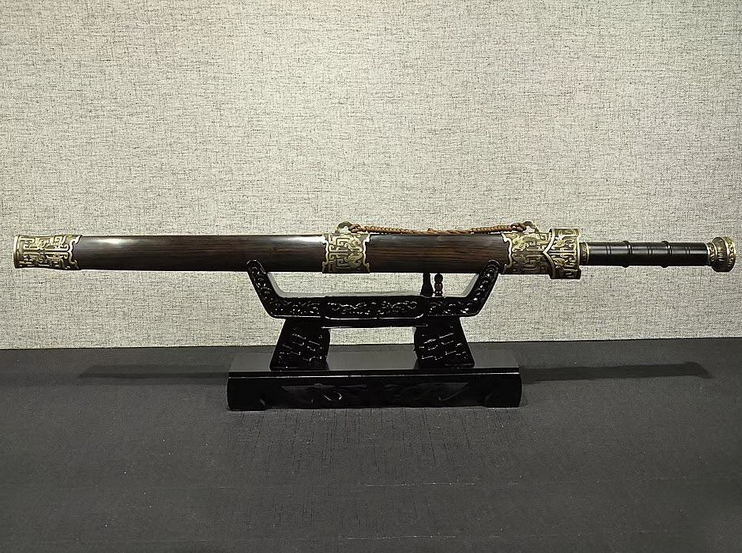 总长:94cm刃长:65cm柄长:20cm刃宽:3.9cm刃厚:0.8cm硬度:59HRC刃材:花纹钢刃表面:二级镜面鞘材:黑檀木柄材:黑檀木装具:纯铜工艺:淬火(盐水)—回火锻打程度:十三道纯手工研磨赠品:锦盒-刀油-收藏证书-刀架![]()