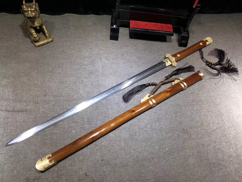 商品属性 [总长] 103cm [刃长] 72cm [柄长] 27cm [刃宽] 3.4cm [刃厚] 0.75cm [硬度] 59HRC [刃材] 花纹钢 [刃表面] 八面研磨 [鞘材] 酸枝木 [柄材] 酸枝木 [装具] 铜装 [工艺] 淬火(盐水)—回火 [锻打程度] 十三道纯手工研磨 [赠品] 锦盒-刀油-收藏证书-刀架