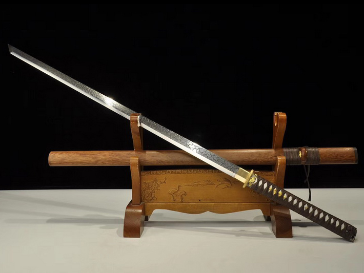 商品属性 [总长] 103cm [刃长] 72cm [柄长] 27cm [刃宽] 3.5cm [刃厚] 0.75cm [硬度] 59HRC [刃材] 锰钢 [鞘材] 花梨木 [装具] 合金 [工艺] 淬火(盐水)—回火 [锻打程度] 十三道纯手工研磨 [赠品] 锦盒-刀油-收藏证书-刀架