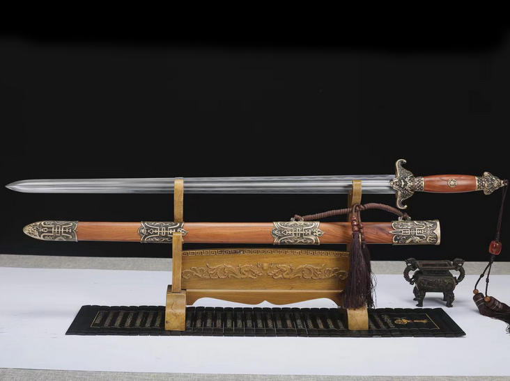 商品属性 [总长] 105cm [刃长] 75cm [柄长] 25cm [刃宽] 3.2cm [刃厚] 0.7cm [硬度] 60HRC以上 [刃材] 百炼钢 [鞘材] 酸枝木 [柄材] 酸枝木 [装具] 纯铜 [工艺] 覆土烧刃—回火 [锻打程度] 十四道纯手工研磨 [赠品] 锦盒-刀油-收藏证书-刀架
