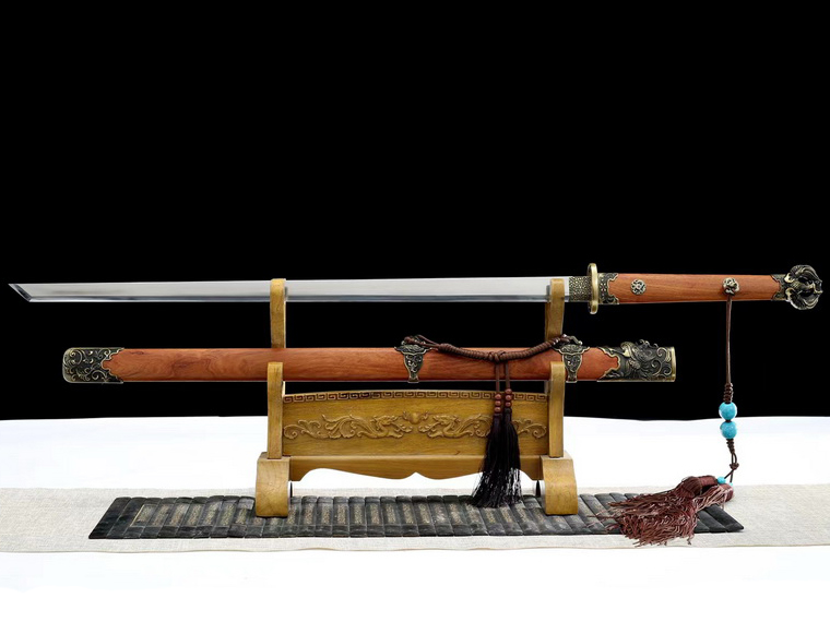 商品属性 [总长] 106cm [刃长] 75cm [柄长] 26cm [刃宽] 3.2cm [刃厚] 0.7cm [硬度] 60HRC以上 [刃材] 高碳钢 [鞘材] 酸枝木 [柄材] 酸枝木 [装具] 铜锌合金 [工艺] 覆土烧刃—回火 [锻打程度] 十三道纯手工研磨 [赠品] 锦盒-刀油-收藏证书-刀架
