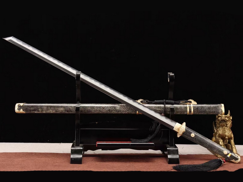 总长:103cm刃长:72cm柄长:27cm刃宽:3.2cm刃厚:0.7cm硬度:60HRC以上刃材:百炼钢柄材:珍珠鱼皮装具:铜装工艺:覆土烧刃—回火锻打程度:十五道纯手工研磨+上研赠品:锦盒-刀油-收藏证书-刀架-刀袋重量:1490g