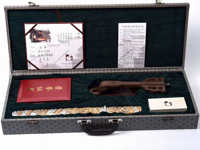 商品参数 总长:45cm 刃长:29cm 柄长:12.5cm 刃宽:2.8cm 刃厚:0.7cm 硬度:60HRC以上 装具:鎏金 工艺:强烧高温热处理-回火 锻打程度:十六道纯手工研磨+上研 赠品:高档木制锦盒-刀油-收藏证书-刀架 重量:1150g