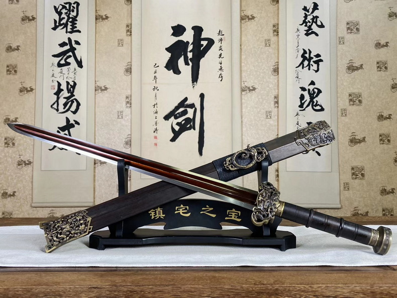 商品参数 总长:80cm 刃长:54cm 柄长:22.5cm 刃厚:0.8cm 硬度:59HRC 刃材:花纹钢 刃表面:发红处理 鞘材:乌木 装具:铜锌合金 工艺:淬火(油)—回火 锻打程度:十三道纯手工研磨 赠品:锦盒-刀油-收藏证书-刀架