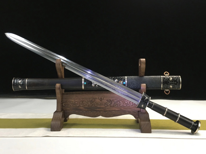 商品参数 总长:92cm 刃长:61cm 刃宽:4.5cm 硬度:60HRC以上 刃材:自炼钢 鞘材:紫光檀木高档鱼皮 装具:铜鎏金鎏银 锻打程度:十四道纯手工研磨 赠品:锦盒-刀油-收藏证书-刀架