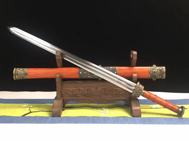 商品参数 硬度:59HRC 刃材:花纹钢 鞘材:红木 装具:铜锌合金 工艺:淬火(油)—回火 锻打程度:十二道纯手工研磨 赠品:锦盒-刀油-收藏证书-刀架