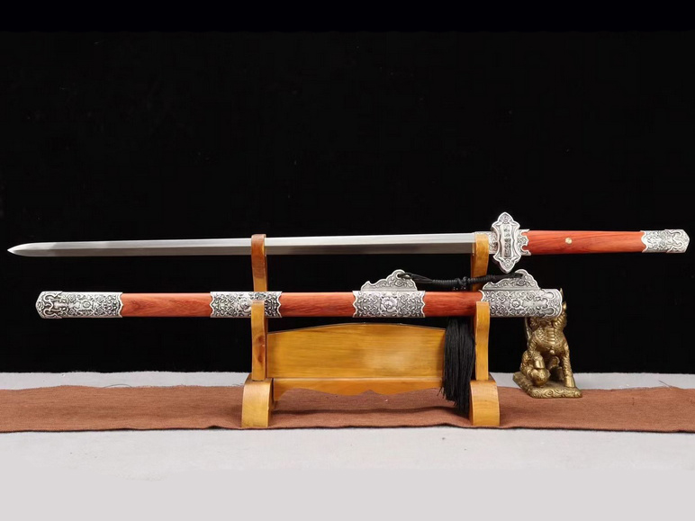 总长:107cm刃长:70cm柄长:27cm刃宽:3.5cm刃厚:0.7cm硬度:59HRC刃材:弹簧钢鞘材:红木柄材:红木装具:镀银工艺:淬火(油)—回火锻打程度:十二道纯手工研磨赠品:锦盒-刀油-收藏证书-刀架重量:1.8kg