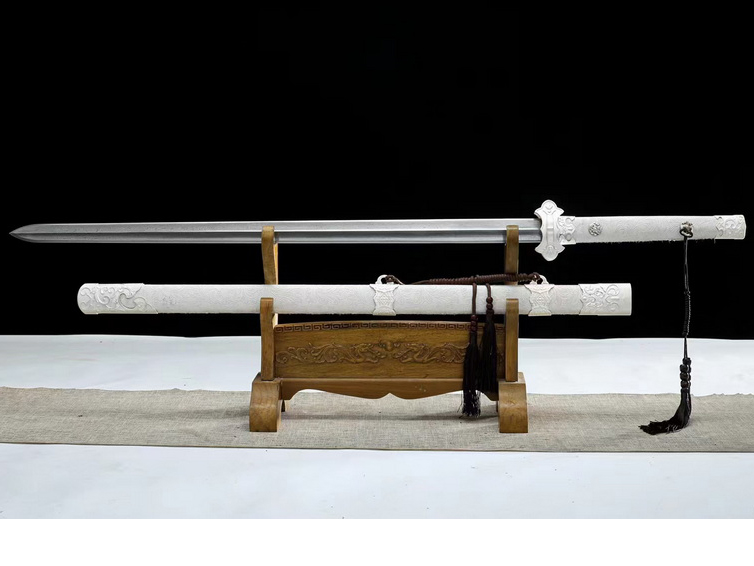 商品属性 [总长] 108cm [刃长] 75cm [柄长] 28cm [刃宽] 3.3cm [刃厚] 0.7cm [硬度] 59HRC [刃材] 花纹钢 [鞘材] 皮革包实木 [装具] 镀银 [工艺] 淬火(油)—回火 [锻打程度] 十三道纯手工研磨 [赠品] 锦盒-刀油-收藏证书-刀架 [重量] 1.5kg