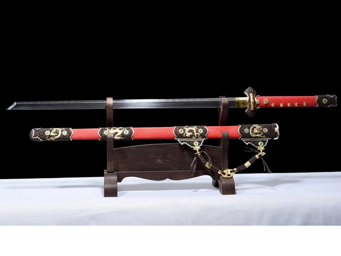 总长:105cm刃长:72cm柄长:26cm刃宽:3.2cm刃厚:0.7cm硬度:60HRC以上刃材:百炼钢鞘材:高档珍珠鱼皮装具:纯手雕鎏真金银工艺:覆土烧刃—回火锻打程度:十五道纯手工研磨+上研赠品:锦盒-刀油-收藏证书-刀架重量:全2kg,净1.2kg