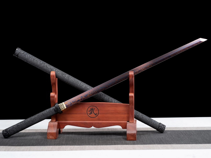商品参数 总长:104cm 刃长:72cm 柄长:27cm 刃宽:3.2cm 刃厚:0.7cm 硬度:59HRC 刃材:花纹钢 鞘材:皮革包实木 装具:铜装 工艺:淬火(油)—回火 锻打程度:十三道纯手工研磨 赠品:锦盒-刀油-收藏证书-刀架