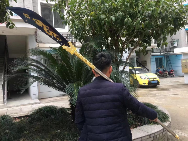 商品参数 总长:205cm 刃长:55cm 刃宽:9.8cm 刃厚:0.7cm 硬度:58HRC 刃材:锰钢 柄材:精钢 工艺:淬火(水)—回火 锻打程度:十二道纯手工研磨 赠品:锦盒-刀油-收藏证书-刀架 重量:5kg