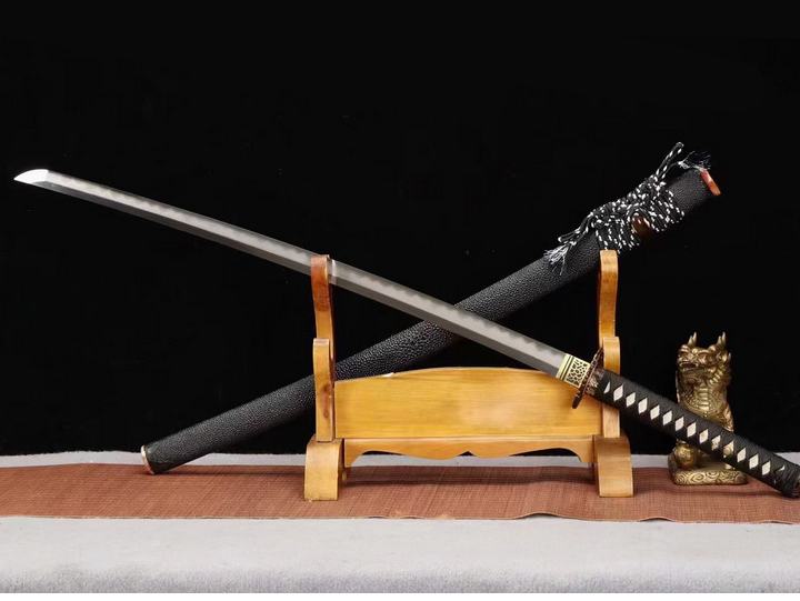 商品属性 [总长] 102cm [刃长] 73.4cm [刃宽] 3.2cm [刃厚] 0.7cm [硬度] 60HRC以上 [刃材] 百炼钢 [刃表面] 精磨上研 [鞘材] 高档珍珠鱼皮 [柄材] 珍珠鱼皮 [装具] 鎏金鎏银 [工艺] 覆土烧刃—回火 [锻打程度] 十五道纯手工研磨+上研 [赠品] 锦盒-刀油-收藏证书-刀架 [重量] 1.5kg