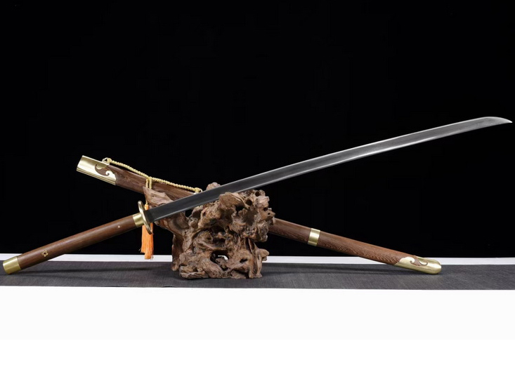 商品参数 总长:145cm 刃长:100cm 柄长:42cm 刃宽:3.9cm 硬度:59HRC 刃材:花纹钢 鞘材:花梨木 装具:包铜 工艺:淬火(水)—回火 锻打程度:十三道纯手工研磨 赠品:锦盒-刀油-收藏证书-刀架