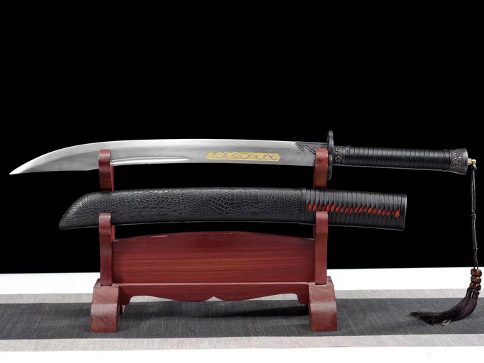 商品属性 [总长] 80cm [刃长] 51cm [柄长] 22cm [刃宽] 4.3cm [刃厚] 0.5cm [硬度] 58HRC [刃材] 锰钢 [鞘材] 实木包皮革 [装具] 合金 [工艺] 淬火(油)—回火 [锻打程度] 十二道纯手工研磨 [赠品] 锦盒-刀油-收藏证书-刀架 [重量] 1.26kg