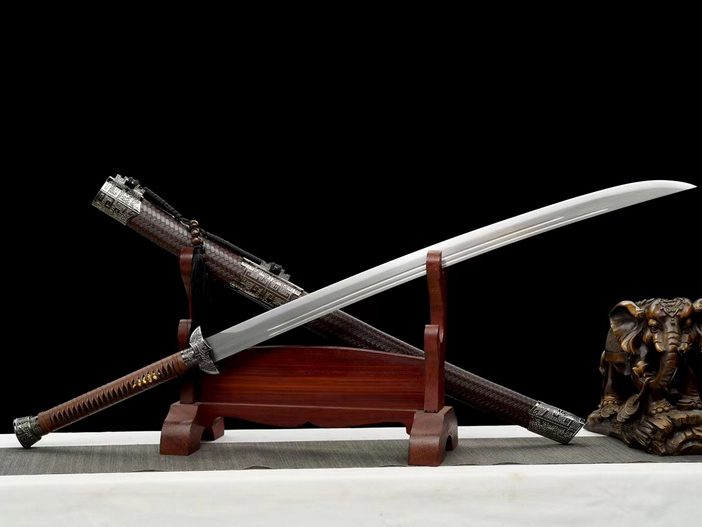 总长:108cm刃长:75cm柄长:28cm刃宽:4cm刃厚:0.6cm硬度:58HRC刃材:锰钢鞘材:实木包皮革装具:合金工艺:淬火(水)—回火锻打程度:十二道纯手工研磨赠品:锦盒-刀油-收藏证书-刀架重量:1.6kg