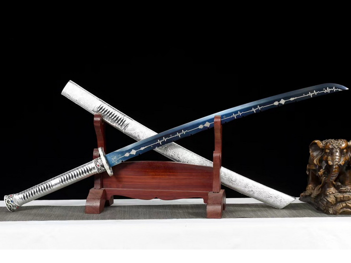 商品参数 总长:108cm 刃长:75cm 柄长:28cm 刃宽:4cm 刃厚:0.6cm 硬度:58HRC 刃材:锰钢 鞘材:实木包皮革 装具:合金 赠品:锦盒-刀油-收藏证书-刀架 重量:1.6kg
