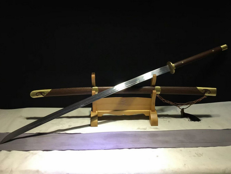 商品属性 [总长] 145cm [刃长] 100cm [柄长] 40cm [刃宽] 3.7cm [刃厚] 0.75cm [硬度] 59HRC [刃材] 花纹钢 [鞘材] 花梨木 [柄材] 花梨木 [装具] 包铜 [工艺] 淬火(水)—回火 [锻打程度] 十二道纯手工研磨 [赠品] 锦盒-刀油-收藏证书-刀架 [重量] 2.45kg