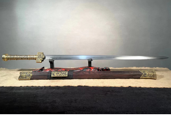 商品属性 [总长] 103cm [刃长] 76cm [刃宽] 3.6cm [刃厚] 0.7cm [硬度] 60HRC以上 [刃材] 草钢锻 [鞘材] 紫光檀木 [装具] 铜装 [锻打程度] 十五道纯手工研磨+上研 [赠品] 锦盒-刀油-收藏证书-刀架-刀袋 [重量] 总重2.28kg,净重1.45kg