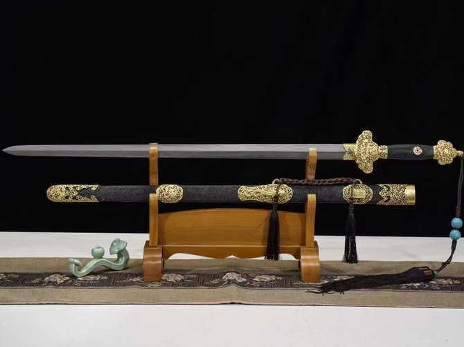 总长:104cm刃长:76cm柄长:20cm刃宽:3.5cm刃厚:0.8cm硬度:60HRC以上刃材:乌兹钢鞘材:高档珍珠鱼皮装具:黄铜镀金工艺:覆土烧刃—回火锻打程度:十六道纯手工研磨+上研赠品:高档木制锦盒-刀油-收藏证书-刀架重量:1.75kg![]()