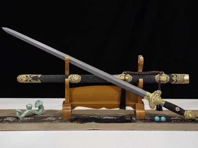 商品属性 [总长] 104cm [刃长] 76cm [柄长] 20cm [刃宽] 3.5cm [刃厚] 0.8cm [硬度] 60HRC以上 [刃材] 乌兹钢 [鞘材] 高档珍珠鱼皮 [装具] 黄铜镀金 [工艺] 覆土烧刃—回火 [锻打程度] 十六道纯手工研磨+上研 [赠品] 高档木制锦盒-刀油-收藏证书-刀架 [重量] 1.75kg