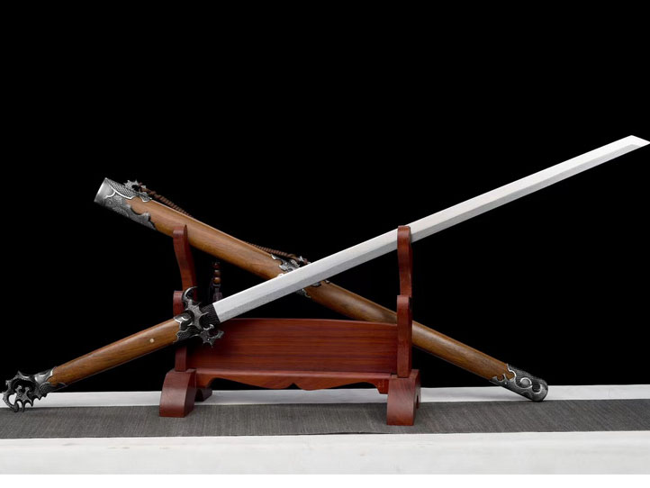 商品属性 [总长] 109cm [刃长] 69cm [柄长] 32cm [刃宽] 3.2cm [刃厚] 0.7cm [硬度] 59HRC [刃材] 花纹钢 [鞘材] 重蚁木 [装具] 镀银 [工艺] 淬火(盐水)—回火 [锻打程度] 十三道纯手工研磨 [赠品] 锦盒-刀油-收藏证书-刀架 [重量] 1.7kg,净重1.2kg