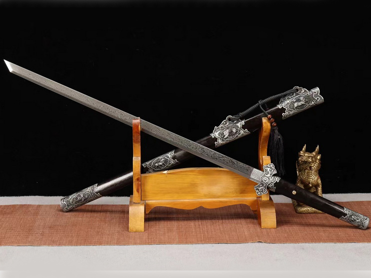 〖总长〗:104厘米〖刃长〗:72 厘米〖柄长〗:27厘米〖刃宽〗:3.2-2.8 厘米〖刃厚〗:0.7-0.5 厘米〖刃材〗:百炼大马士革钢〖硬度〗:60〖鞘材〗:乌木〖装具〗:镀银〖总重〗:约 1490克〖净重〗:约 1040克〖刃身〗:一体锻打刀身〖工艺〗:刃身手工锻造,经过打坯、热煅、铲、锉、研磨、粹火,回火、手工研磨等龙泉刀剑古法制造工序制作而成。