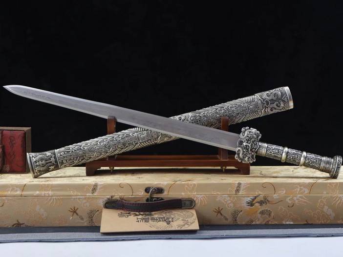 商品属性 [总长] 82cm [刃长] 55cm [柄长] 22cm [刃宽] 3.1cm [刃厚] 0.9cm [硬度] 60HRC以上 [刃材] 大马士革钢 [鞘材] 纯铜精雕 [工艺] 淬火(盐水)—回火 [锻打程度] 十四道纯手工研磨 [赠品] 锦盒-刀油-收藏证书-刀架 [重量] 全重3.1kg,净重1.45kg