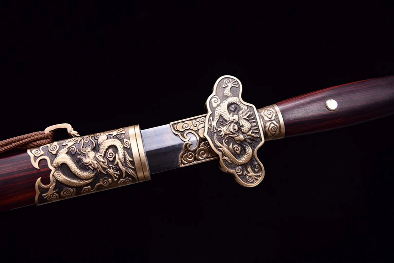 商品参数 刀装:黄铜复古工艺 鞘材:红檀木 钢材:锋钢手工锻打,高温淬火,手工研磨 全长106cm 刃长75.5cm 柄长25.5cm 刃宽3.5cm; 除鞘重约1187.5g全重、约1988.5g