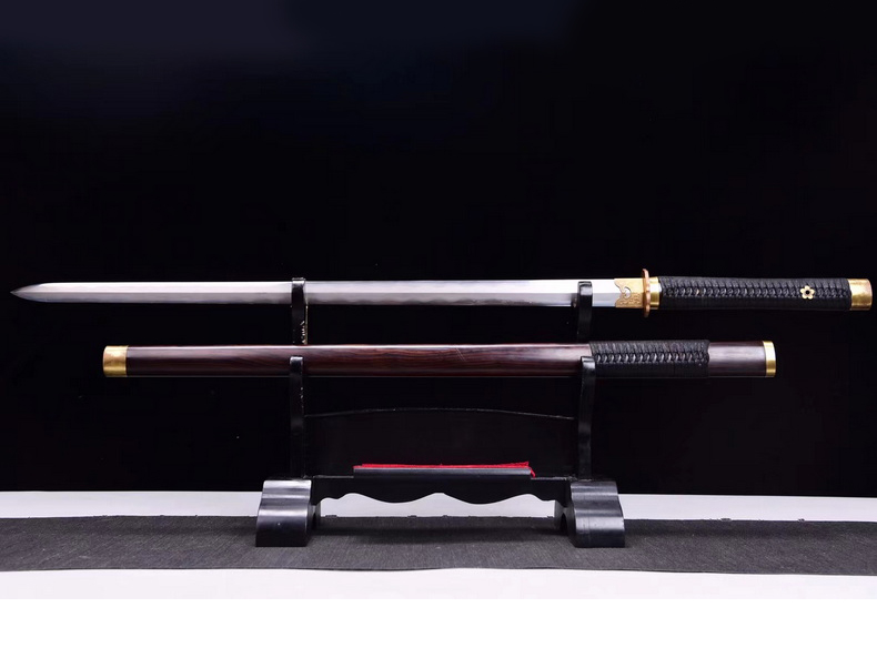 商品属性 [总长] 106cm [刃长] 77cm [柄长] 27.5cm [刃宽] 3.2cm [硬度] 60HRC以上 [刃材] 百炼钢 [刃表面] 双线精研 [鞘材] 黑檀木 [装具] 纯铜 [工艺] 覆土烧刃—回火 [锻打程度] 十四道纯手工研磨 [赠品] 锦盒-刀油-收藏证书-刀架 [重量] 全重1.4kg,净重873g