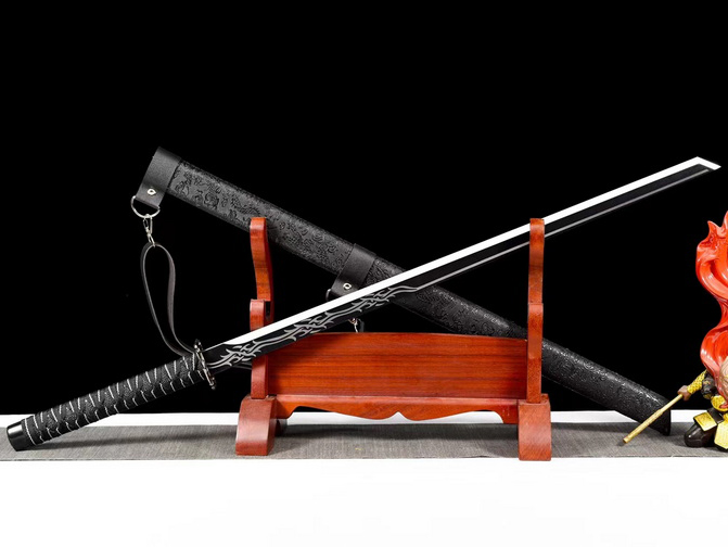 商品参数 总长:98cm 刃长:67cm 柄长:24cm 刃宽:3.2cm 刃厚:0.5cm 硬度:57HRC 刃材:高碳钢 鞘材:实木包皮革 装具:合金 赠品:锦盒-刀油-收藏证书-刀架 重量:1kg