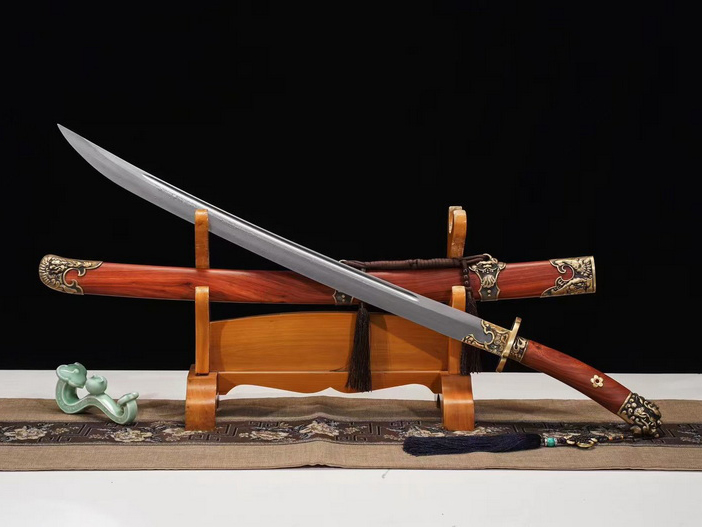 商品属性 [总长] 96cm [刃长] 69cm [柄长] 20cm [刃宽] 4cm [刃厚] 0.7cm [硬度] 60HRC [刃材] 百炼钢 [鞘材] 酸枝木 [装具] 铜装 [工艺] 淬火(盐水)—回火 [锻打程度] 十三道纯手工研磨 [赠品] 锦盒-刀油-收藏证书-刀架 [重量] 1.95kg,去鞘1.1kg